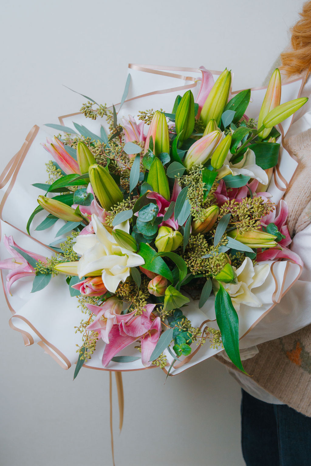 Blush Lily Grace is an elegant hand-tied bouquet featuring fresh pink and white lilies, complemented by soft seasonal greenery and eucalyptus. Designed to feel light, refined, and timeless, this bouquet embodies natural beauty with a modern touch.