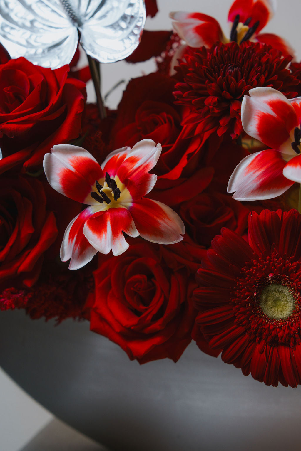 Scarlet Opulence is a striking luxury floral arrangement designed to command attention through rich red tones, refined textures, and sculptural form. Featuring premium blooms artfully arranged in a modern silver bowl, this piece embodies modern elegance and timeless sophistication.